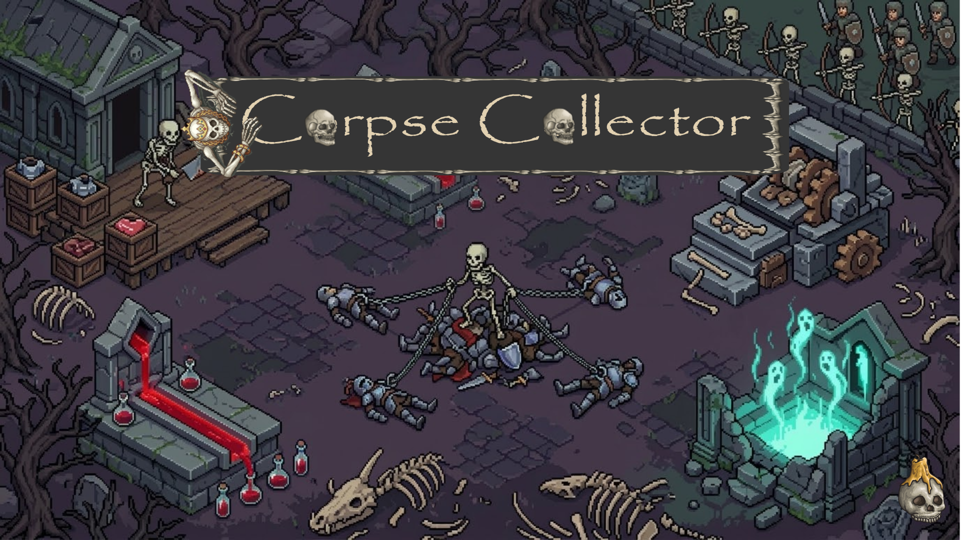 In Corpse Collector, you are the foreman of the Harvest Yard. Command the Skeleton Grappler, defend your walls against the living, and refine the fallen into the fuel for your undead empire.